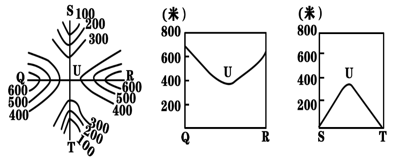 (5)峡谷等高线地形图:两山脊间的狭窄部分,是修建水库的最好选址。