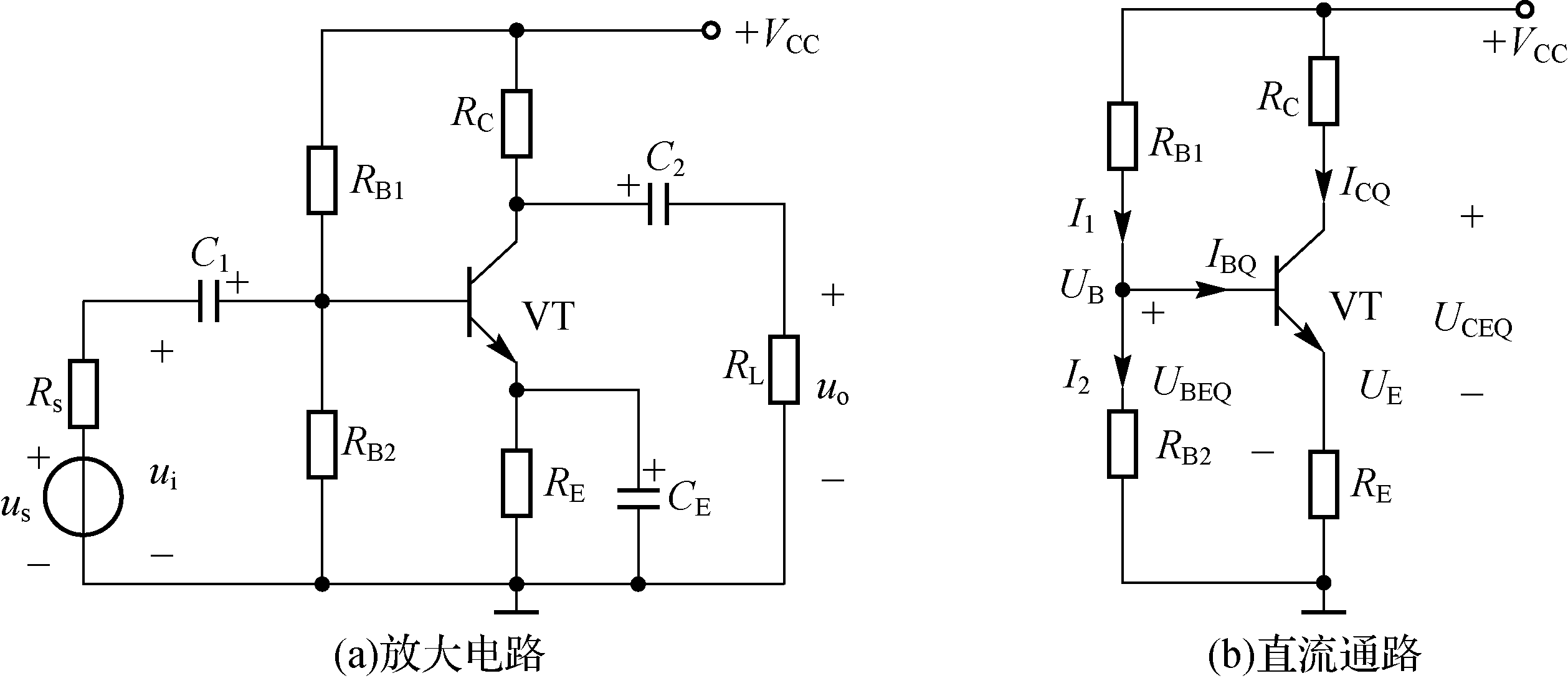 图7-16(a)所示为稳定静态工作点的共发射极放大电路,这是由RB1和RB2组成的分压式偏置电路,故称为分压式偏置放大电路。这种电路可以根据温度的变化自动调节基极电流IB,以削弱温度对集电极电流IC的影响,使静态工作点基本稳定。