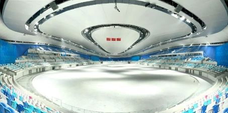 2022年冬奥会在北京举行,“冰丝带”国家速滑馆是唯一新建的冰上竞技赛场馆,它的外形上由22条晶莹美丽的“丝带”状曲面玻璃幕墙环绕,与明亮剔透的超白玻璃相结合,象征着速度滑冰运动员在冰上留下的滑行轨迹。