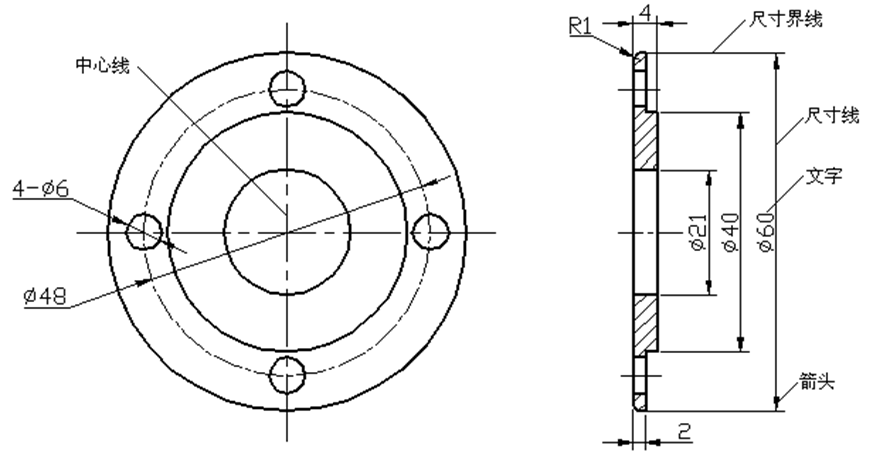 尺寸标注是由文字、尺寸线、尺寸界线、箭头、中心线和圆心标记等元素组成的。