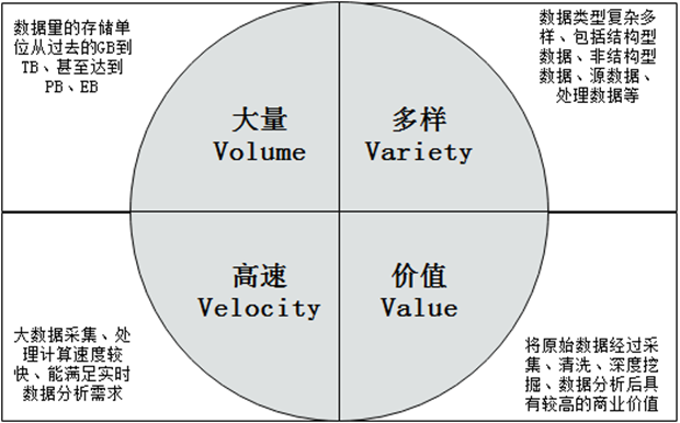 大数据主要具有以下四个方面的典型特征,即大量(Volume)、多样(Varity)、高速(Velocity)和价值(Value),即所谓的“4V”。