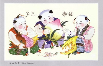 天津杨柳青木版年画《福寿三多》