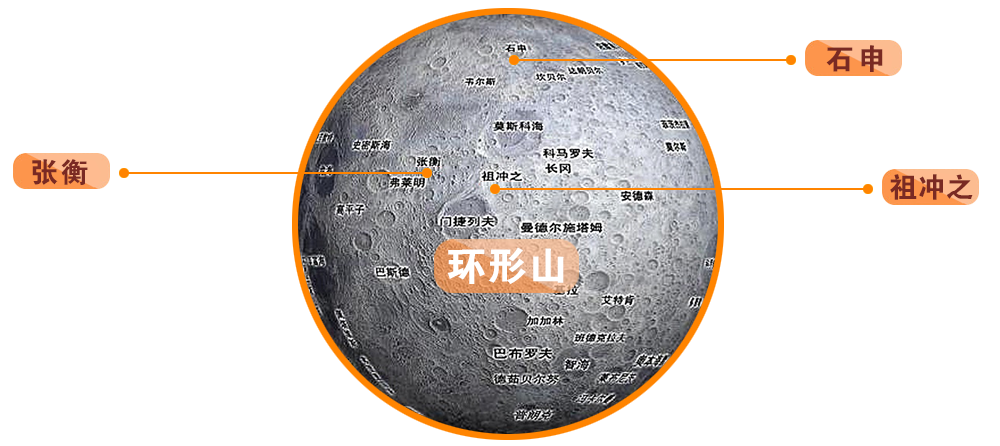 环形山大多数以著名天文学家或其他学者的名字命名,月球背面的环形山中,有六座分别以我国古代天文学家名字命名。