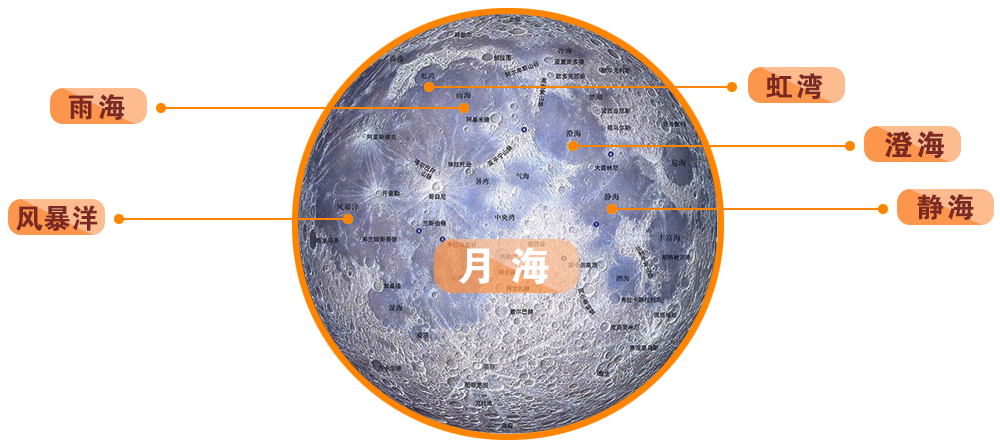 所谓的月海,是指月球月面上比较低洼的平原,用肉眼遥望月球有些黑暗色斑块,这些大面积的阴暗区就叫做月海。月海是月球表面的主要地理单元,总面积上约占全月面的25%。迄今已知的月海有22个,绝大多数月海分布在面向地球月球的正面,正面月海约占半球面积的一半;月球背面只有东海、莫斯科海和智海共3个,而且面积很小,占半球面积的2.5%。月海虽叫做“海”,但徒有虚名,实际上它滴水不含,只不过是较平坦的比周围低洼的大平原,它的表层覆盖类似地球玄武岩那样的岩石,即月海玄武岩。