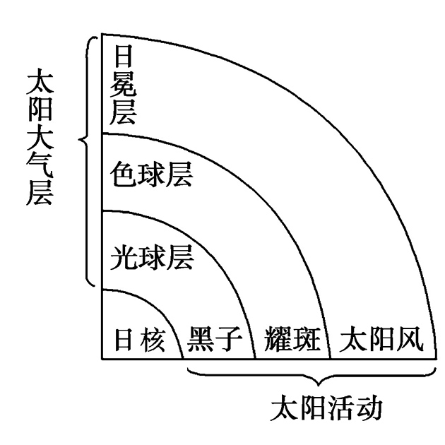 根据太阳活动的相对强弱,太阳可分为宁静太阳和活动太阳两大类。宁静太阳是一个理论上假定宁静的球对称热气体球,其性质只随半径而变,而且在任一球层中都是均匀的,其目的在于研究太阳的总体结构和一般性质。在这种假定下,按照由里往外的顺序,太阳是由核心、辐射区、对流层、光球层、色球层、日冕层构成。光球层之下称为太阳内部;光球层之上称为太阳大气。