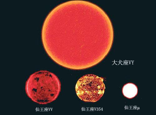 (一)体积是关键。太阳河我们知道的更大的恒星比起来,它的大小不值一提。我们一直的最大恒星是大犬座VY,被一些天文学家称作蓝色特超巨星。距离地球4900光年,被称为“大狗”。如果太阳也那么大,那么太阳会吞掉附近的水星,金星,地球,火星和木星,到达土星的面前,直径达到14亿千米。
