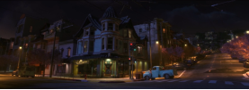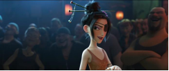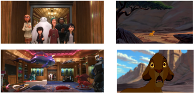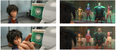 《超能陆战队》中的景深镜头。前景妈妈在做饭,并跟小宏说话。而中景的小宏则要在不被卡斯阿姨发现的前提下,拖拽没电的大白上楼,场面十分的有趣。