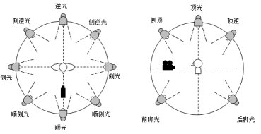 光线角度是指光源位置与拍摄方向之间,所形成光线的照射角度。在摄像机与被摄对象的方位确定后,以被摄对象为中心,可从水平垂直方向分为多种光线形态。