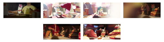 短片第一大段落主要表现小狗温斯顿,逐渐过上了幸福生活,可以和男主人在同一个餐桌上享受美味盛宴。镜头之间多用动作和相似物进行衔接,多个镜头形成积累蒙太奇,强调小狗饮食的改变。