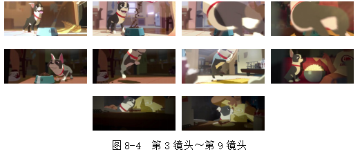 在第3镜头~第9镜头中,表示温斯顿的饮食已经由狗粮升级到与男主人分享高热量的美味盛宴,如图8-4所示。这些镜头形成了积累蒙太奇,强调温斯顿对“垃圾食品”的热爱。同时,镜头在组接时也很有技巧。在第3镜头~第8镜头之间的镜头组接时,使用了动作转场和相似物转场技巧。画面中小狗的变化不大甚至相同,而前后镜头之间的动作却是基本连贯的。在第4、5镜头组接时,小狗又用身体遮挡住了大部分画面,使得观众忽略了场景的转换。在第6镜头~第9镜头之间的镜头组接时,小狗的动作都是向上跃起的,这样在动作上形成了积累,也使得组接更加的自然连贯。