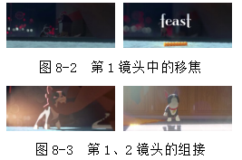短片第1镜头就是一个移焦镜头,如图8-2所示。焦距先对准后景中,找食物的小狗温斯顿身上,表示它是一个可怜的、挨饿的流浪狗。然后一根薯条从画面右侧入画,落在前景的地面上,焦点也从后景移到前景,同时片名也淡入画面。接着是拉镜头,将男主人逐渐展现在画面中,以表示薯条的来源。此时,温斯顿也从后景运动到前景,并男主人有了接触。在这个镜头中,合理使用演员调度和镜头调度,使得镜头内容丰富,展现了许多剧情。