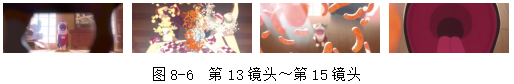 在第13镜头~第15镜头中,则是以特殊的镜头和视点,表示温斯顿在享受美食上,与男主人的默契,如图8-6所示。第13镜头中,短片创作者选择从11号机位,男主人的胯下,这一独特的导演视点展现温斯顿。而在演员调度时,小狗温斯顿也从画面左侧逐渐入画,走到画面中央,张嘴等待事物的来临。紧接着反打升格镜头,满屏“垃圾食物”冲向镜头。再使用俯视推镜头正打回温斯顿,镜头跟随食物冲向温斯顿的嘴中,形成遮挡转场。