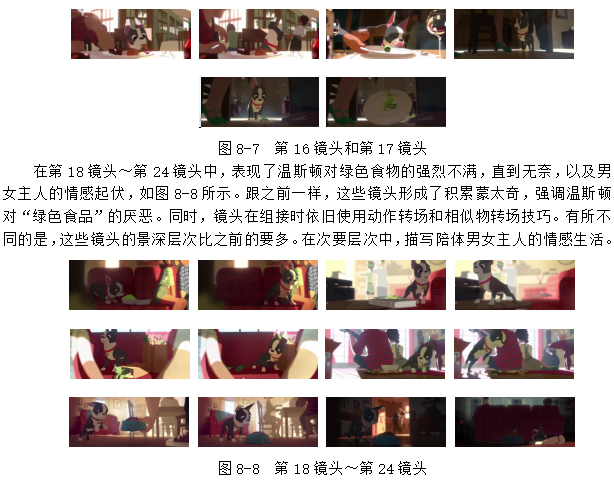 短片第16镜头和第17镜头表现了男女主人公的邂逅,以及小狗温斯顿健康饮食的转变,如图8-7所示。第16镜头开始由虚焦调整到对焦,呼应前一段落的过渡。镜头开始时,温斯顿和主人在餐厅吃饭,然后演员调度,女主人从画面右侧入画,与他俩交流后向纵深深处走去,而男主人与温斯顿的视线则跟随女主人,向右后景方向望去。当主体人物温斯顿开始转回头时已经是第17镜头了,短片利用这个转头动作巧妙转场。然后是对温斯顿的跟镜头,直到掀起的餐盘挡住画面,镜头结束。镜头调度一直是跟随小狗温斯顿的,表现女主人的到来后,它就不能上餐桌了,并且要吃绿色食物。同时,也表现次要人物,男女主人感情的建立。