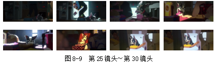 在第25镜头~第30镜头中,表现女主人走后,小狗温斯顿又可以享受它的美味盛宴了,只是男主人没有以往的神采,如图8-9所示。第25镜头画面较暗,主要依靠演员调度和灯光调度来引导观众的趣味中心点。先是女主人从画面右侧开门离开,通过门后灯光、演员走位、开关门音响等元素引导观众注意。然后,就是男主人打开冰箱,后景出现大面积冷光。这样就可以更加清楚的看到前景主体温斯顿的表情和动作,以及男主人的动作。