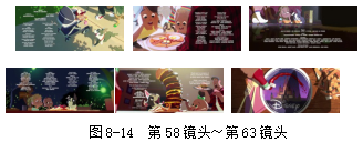第58镜头~第63镜头是片尾字幕,但同时画面也表现小狗温斯顿与小主人一同享受美味盛宴,如图8-14所示。第58镜头~第62镜头画面都有微微的运动,以避免画面太过死板单调。在第63镜头中,运用了番茄汁和餐盘等元素,绘制了出品方迪士尼的标志。
