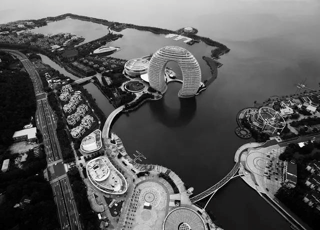 向心式构图有万向引力之功,具有突出主体的鲜明特点。主体处于画面中心位置,而四周景物随即向中心聚集,观者的视线瞬间被引向主体中心,起到强有力的聚集焦点作用。此类构图法较适于航拍城市建筑。(图3-37)