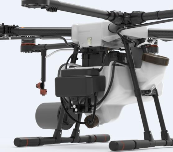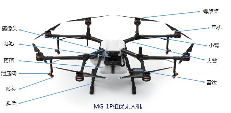 整机机身部件由螺旋桨、电机、小臂、大臂、雷达、摄像头、电池、药箱、泄压阀、喷头等构成。其中电机与螺旋桨属于植保机的动力系统,使其能够飞行。脚架、大臂、小臂都属于机身结构。雷达能够实现避障以及地形跟随功能。摄像头能够实时回传图像。泄压阀与喷头属于植保机喷洒系统,实现药液喷洒。