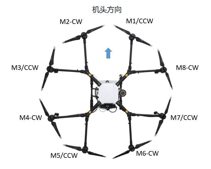 M1-M8是指电机的排序;如:M1是指1号电机,以此类推。CCW表示逆时针旋转;CW表示顺时针旋转。需要注意的是,1、3、5、7号必须安装CCW电机及桨叶;2、4、6、8号必须安装CW电机及桨叶。