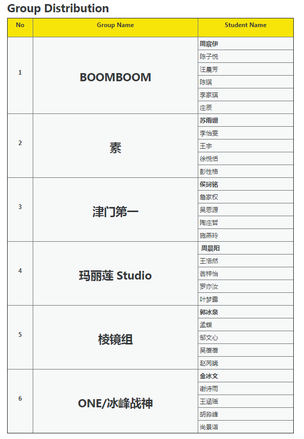 全班31人,选出6名设计总监,每位设计总监选出一名总设计师,再由设计总监和总设计师共同选择设计师1、2、3,每组5~6人。