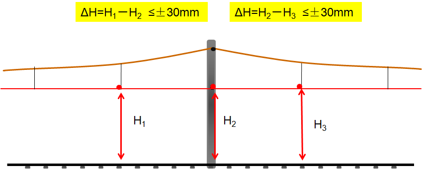 两相邻悬挂点等高相对差不得大于20mm;同一跨内相邻吊弦处的导高差应符合设计预留弛度的要求,施工偏差不得大于5mm。