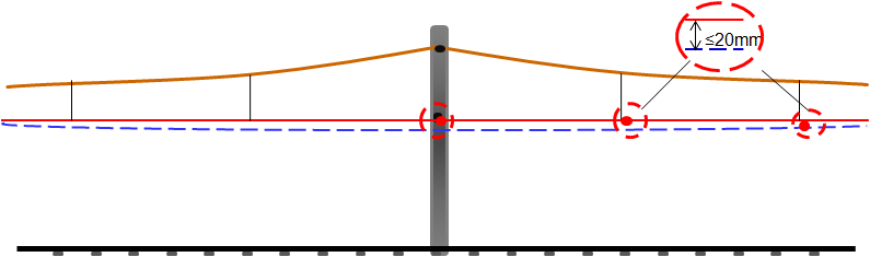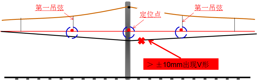 对于行车速度在160kM/h~200kM/h时,对施工误差要求更加严格:定位点两侧第一吊弦处接触线高度应等高,相对该定位点的接触线高度的施工偏差为±10mm,但不得出现“V”字形;