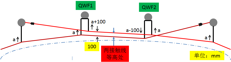 三跨非绝缘锚段关节也是仅用作接触悬挂在机械方面的分段,电气方面仍然相联结。此时用电连接线将工作支和非工作支连接起来,保证电流通过。在这种锚段关节内,其承力索和接触线在两转换支柱之间的跨距中心处过渡。过渡处,两接触线等高,且相距100mm,非工作支在转换支柱处抬升200mm,然后拉向锚支柱(抬升500mm)去下锚,如图所示。在图中,Z表示直线区段;Q表示曲线区段;F表示非绝缘锚段关节;下标1、2表示转换支柱装配的形式。