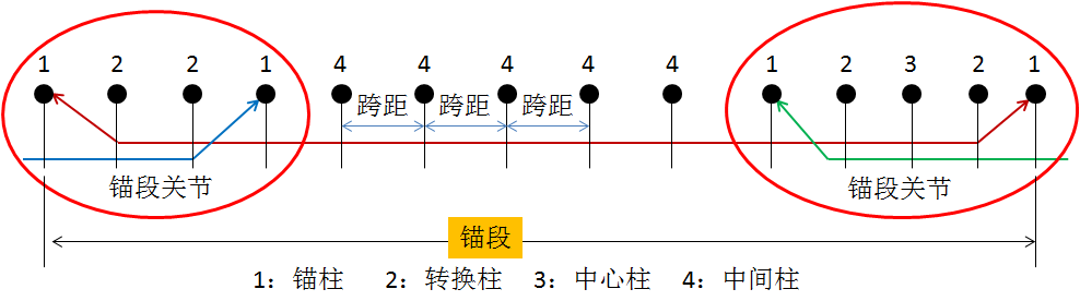根据锚段关节所含跨距数可分为二跨、三跨、四跨、五跨、七跨及九跨式锚段关节。所谓三跨式锚段关节,就是锚段关节内含有三个跨距,其余类推。