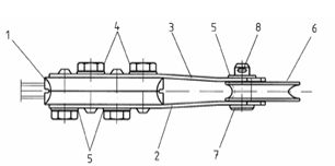 半补偿中心锚结辅助绳采用GJ—50镀锌钢绞线(19股)制成,辅助绳中间用中心锚结线夹与接触线固定。当一侧接触线断线后,另一侧接触线在中心锚结辅助绳的拉力下,不发生松动现象,起到了缩小事故范围的作用,其结构形式如图所示。