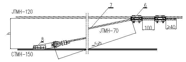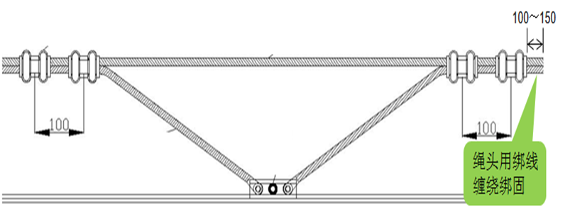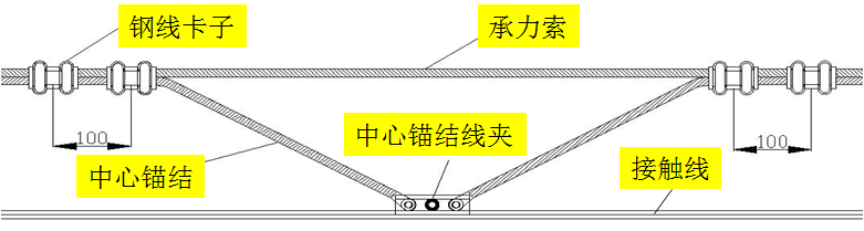 中心锚结绳的两端应分别用两个相互倒置的钢线卡子固定,卡子之间的距离为100mm,绳头距卡子为100~150mm,绳头应用绑线缠绕绑固。由于承力索没有补偿装置,所以半补偿链形悬挂中心锚结具备防断功能。