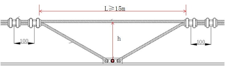 二跨式中心锚结固定方式同三跨式中心锚结一样,由接触线中心锚结和承力索中心锚结两部分组成。接触线的中心锚结辅助绳采用不锈钢软绞线(截面积不小于50mm2),在定位点两端用专用的中心锚结线夹与接触线固定(中心锚结绳与中心锚结线夹压接连接)。而承力索的中心锚结材质和型号选用与所在的承力索相同,通过在接触线中心锚结所在的跨距内增加一根承力索,在该定位点的腕臂上固定后,使该跨距的承力索不产生移动,因此承力索中心锚结由两个跨距组成。承力索辅助绳固定在定位点两端支柱上,安装时辅助绳应抬高锚固,一般不低于承力索高度,如图所示。