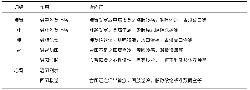 本类药物大多辛温大热,辛能散,性热祛寒,偏走在里脏腑,祛散在里寒邪,振奋阳气而奏温里散寒之功,故本类药物属升浮之性,多归脾胃经。又能温肾、暖肝、温心、温肺,也归肾肝心肺经。部分药物具有毒性。