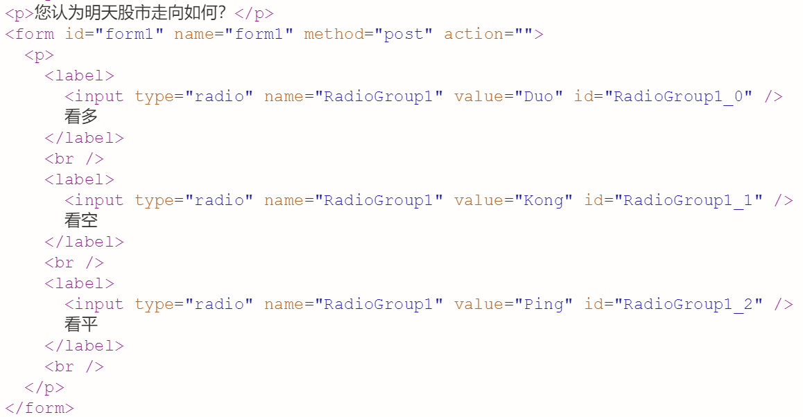 (2)每个单选框的name属性都要设置为同一个值,它们才能被认为是一组单选框,同一组单选框中只能选中其中一个,被选中的单选框对象的value值将作为整个单选框组的值提交,所以每个单选框控件都必须设置。后台程序通过 document.getElementByName("RadioGroup1").value; 获取该组单选框的值。