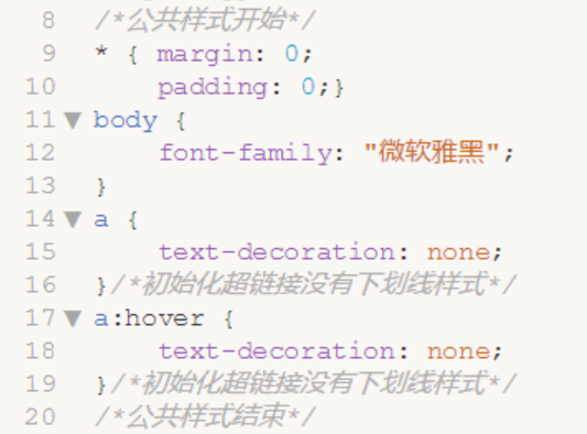 4、编写公共的样式(如边距、字体、颜色、字体大小、列表样式、超链接伪类样式等)