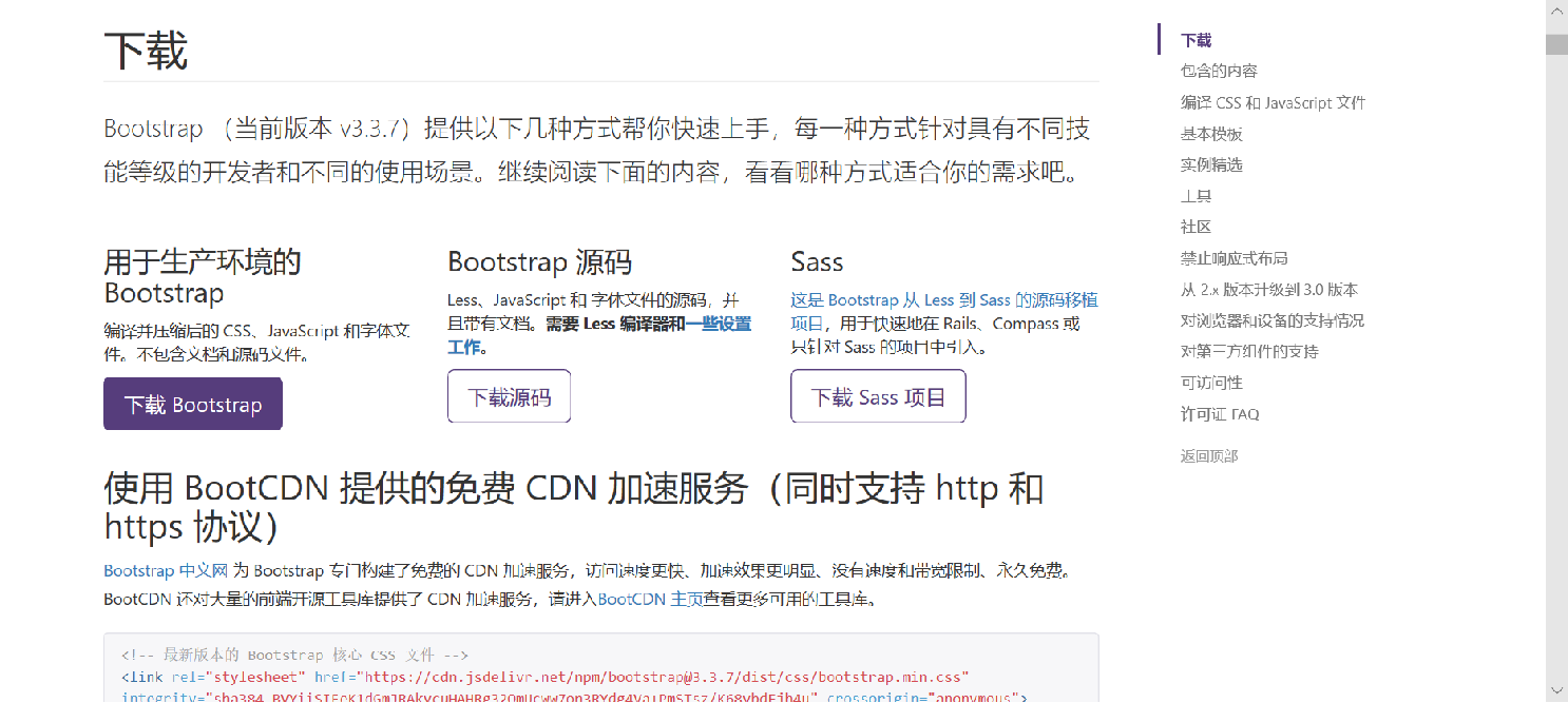 使用 BootstrapCDN 从而跳过下载,将 Bootstrap 的预编译 CSS 和 JS 文件利用缓存加载到你的项目中。
