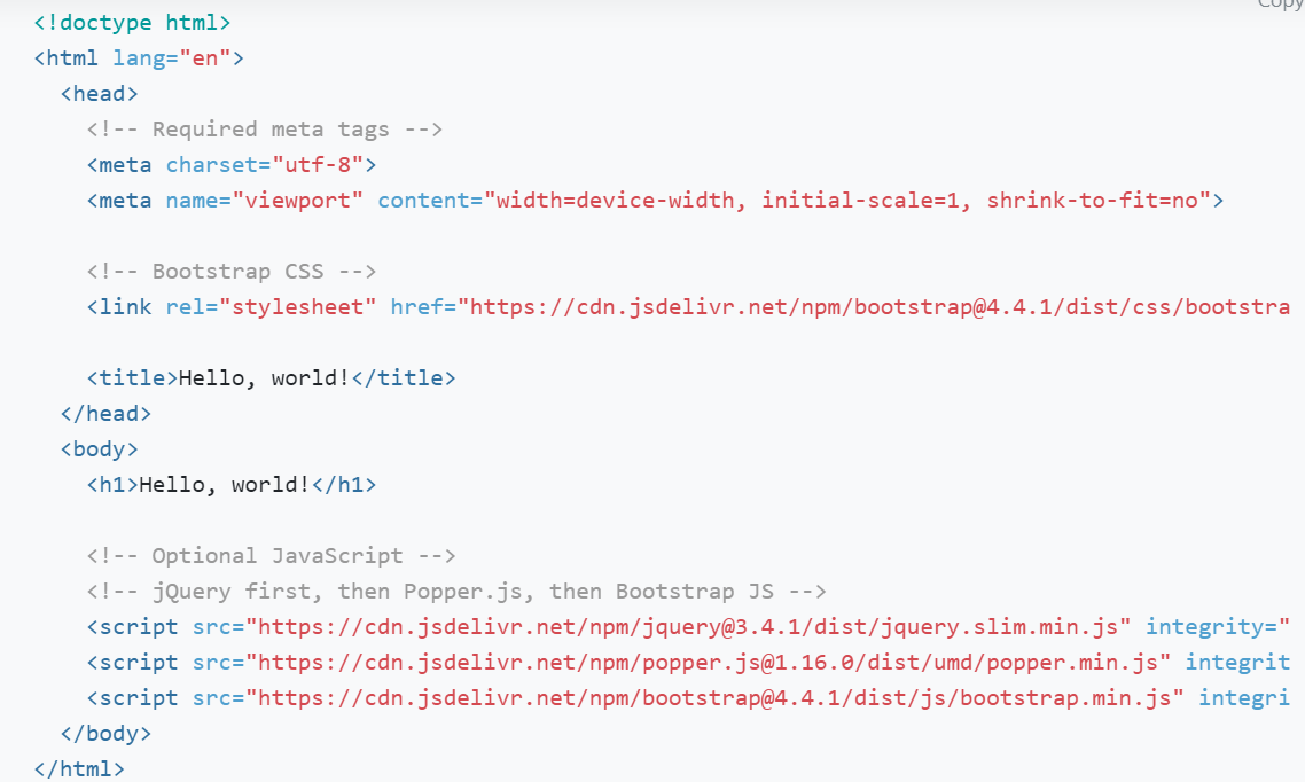将 Bootstrap 的 CSS 文件以 <link> 标签的形式添加到 <head> 标签中,并放置在所有其它样式表之前就行了。<link rel="stylesheet" href="https://cdn.jsdelivr.net/npm/bootstrap@4.4.1/dist/css/bootstrap.min.css" integrity="sha384-Vkoo8x4CGsO3+Hhxv8T/Q5PaXtkKtu6ug5TOeNV6gBiFeWPGFN9MuhOf23Q9Ifjh" crossorigin="anonymous">
