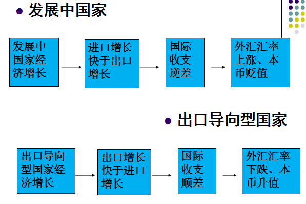 一国经济增长状况对汇率变动影响较复杂:①对发展中国家;②对出口导向型国家