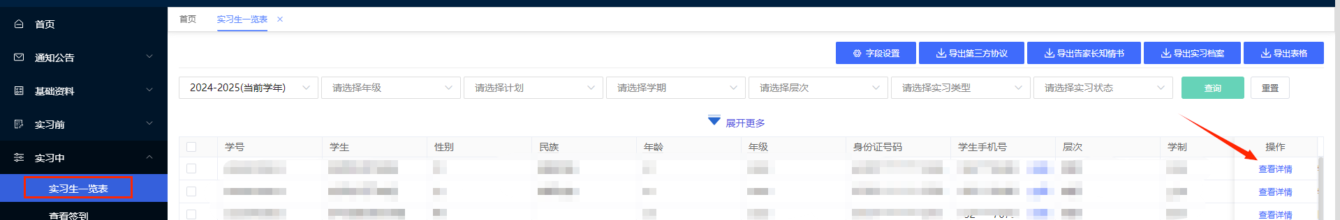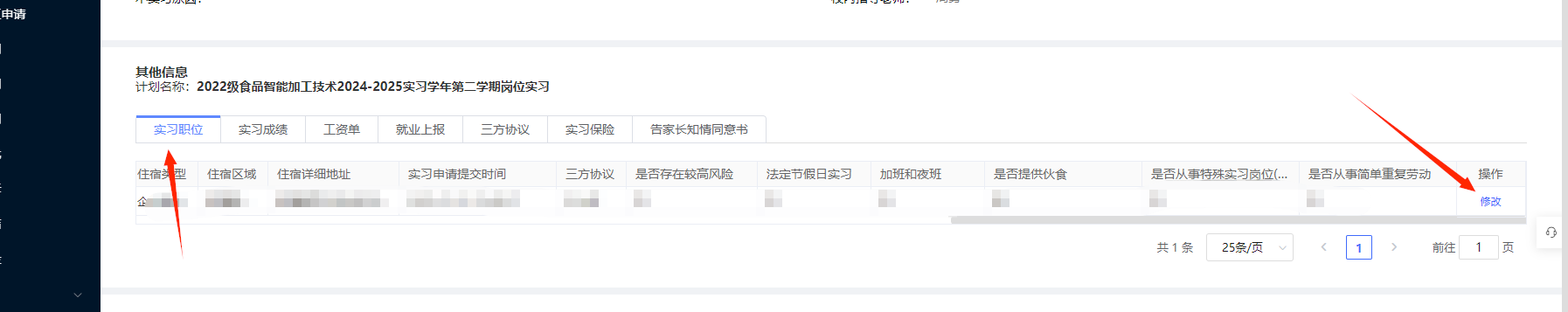 系统开放修改权限后,打开电脑网页端,实习中——实习生一览表,点击查看详情,右下角的修改按钮进去可以修改(只有审核通过的岗位才有修改按钮)