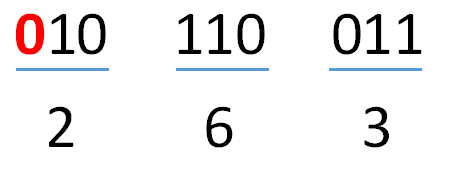 第二步:将对应划分的三位二进制数转换为一位八进制数,并写在划线的下方。
