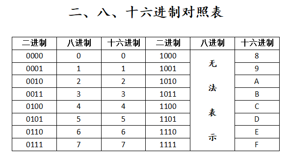 对二进制转换为八进制以及十六进制,可参照如下对照表进行。