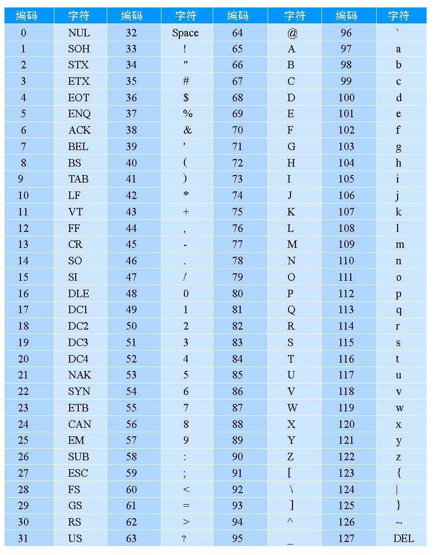 ASCII码称之为美国标准信息交换码,较为重要的几个码值有: