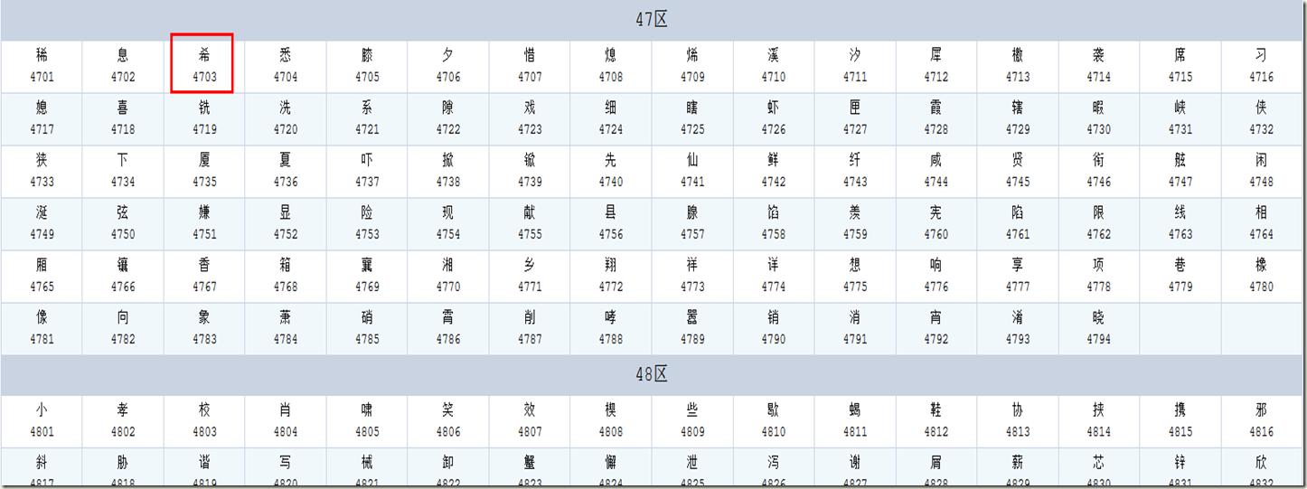 区位码是一种特殊的输入法,将大量的文字存入表格之中,一行为区,一列为位,各有编号,区号和位号能准确确定一个汉字。如下图: