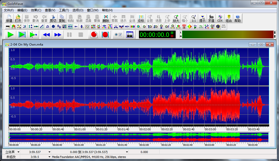 音频通常使用“波形”进行描述和存储,通常图像中横轴表示时间,纵轴为振幅,两个图像分别代表左右声道。由于声音频率较大,所以在图像中的信号不是“正弦”,而是实心的。