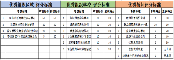 寒假活动将评选出优秀组织区域5名,优秀组织学校5名,优秀辅导教师10名,如下图为评分标准: