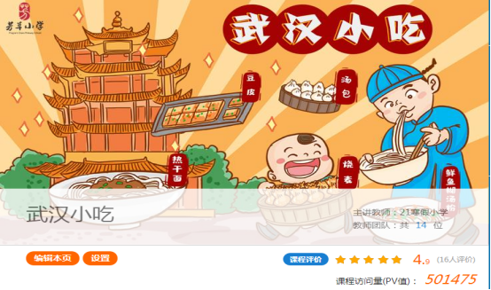 《武汉小吃》是小学段课程,由武汉市汉阳区芳草小学教师团队制作的校本课程,寒假活动期间共计4496人报名学习,课程访问量达到了501475次,得到了4.9分的好评。如下是课程数据截图展示: