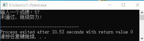 第二次程序运行时,输入 57,则输出"未通过,继续努力!",如下图所示。
