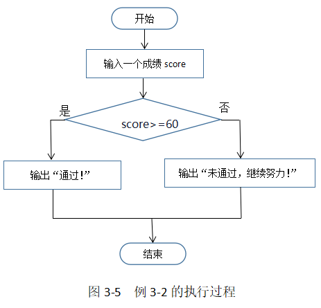 例3-2 输入一个成绩score,如果成绩大于等于60,则显示"通过!",否则显示-未通过,继续努力!"。