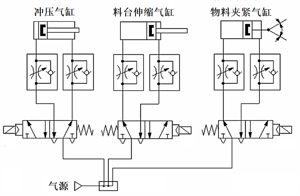加工单元气动控制回路的工作原理如图4-8所示。