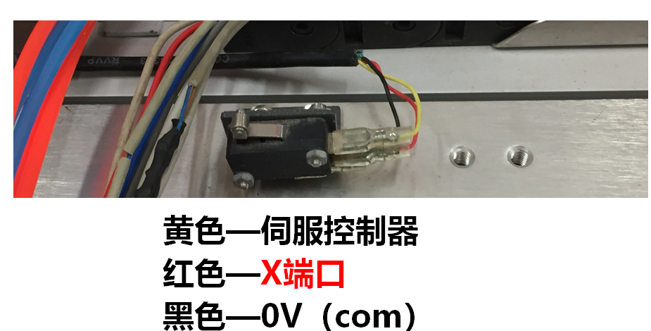 限位开关,将其红色线接入X模块中间排的X端口,黑色线接入X模块下排的GND端口,黄色线接入伺服控制器。
