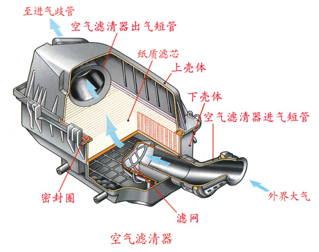 ②结构:空气滤清器一般由滤网、纸质滤芯、壳体和进出气短管等组成。