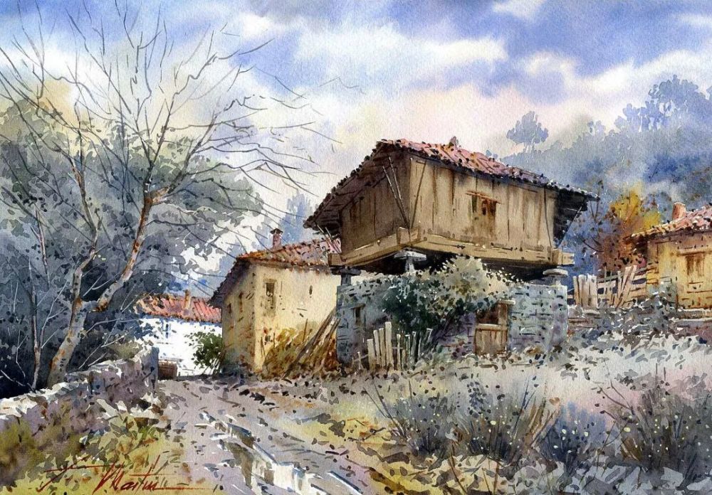 有时在毛毛细雨的天气下画风景写生,画面颜色被细雨淋湿,出现一种天趣,引人入胜。有时在着色前先喷水,有时在颜色未干时喷水.喷水壶要选用喷射雾状的才好,水点过大容易破坏画面效果.喷水法可以打破沉闷单调的画面,也可以创造出偶然的色彩肌理,有时根据需要也可以用来表现远处的虚无的景物。